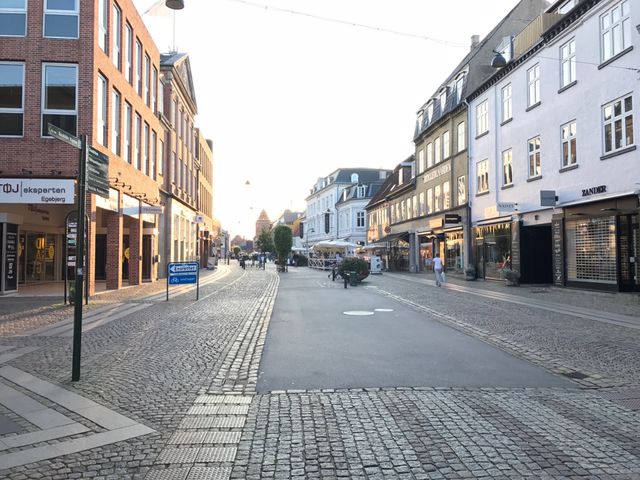 Rua compartilhada em Roskild, Dinamarca. Uma solução estratégica para manter o fluxo de carros em baixa velocidade e priorizar os pedestres. Foto: Ana Paula Wickert.