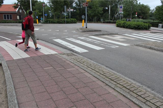 Travessia segura em cidade do interior da Holanda, com refugio central e travessia em nível garantindo acessibilidade. Foto: Ana Paula Wickert.
