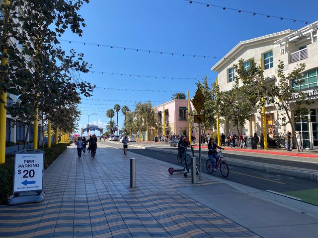 Calçada de acesso ao Pier Santa Monica, Califórnia. Note-se a largura e a suavidade da rampa de travessia, garantindo acessibilidade sem colocar em risco os caminhantes da lateral. Foto: Ana Paula Wickert.