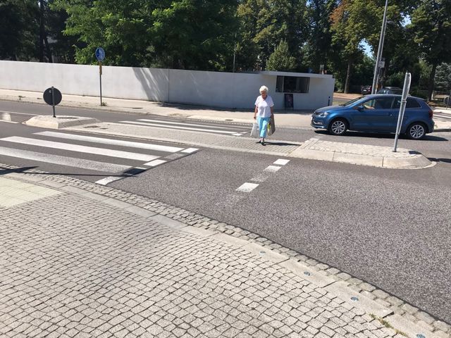 Travessia segura em Dessau Alemanha. O refugio central garante ao pedestre, travessia com mais segurança, especialmente em vias de mão dupla. A rampa de acessibilidade também é bastante suave, sem degraus na calçada. Foto: Ana Paula Wickert.