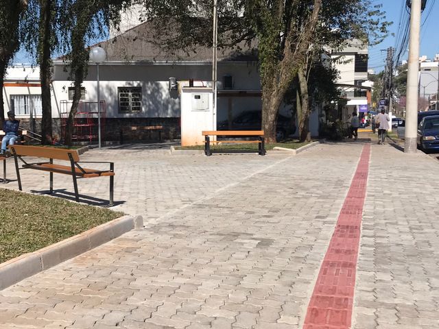 Calçada renovada junto a área de equipamento público em Passo Fundo, RS. Destaque para a implantação de bancos que facilitam a acessibilidade. Foto: Ana Paula Wickert.